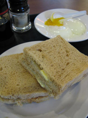 シンガポールの定番らしい朝食、カヤトーストを喫茶店でいただきました。