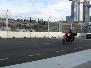 マーライオン公園付近、そこかしこで工事してるのですが、なぜか道路を見下ろすようにして座席が作られている。球場とかにあるような座席。