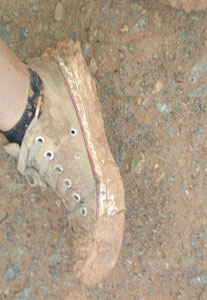 近所の家で井戸を借りて、足と靴を洗わせてもらいました。おおおおお