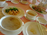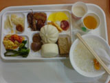 ビュッフェ形式で好きな具をトレーに好きなだけ取り、おかゆ(芋が入っている)を貰って食べる。